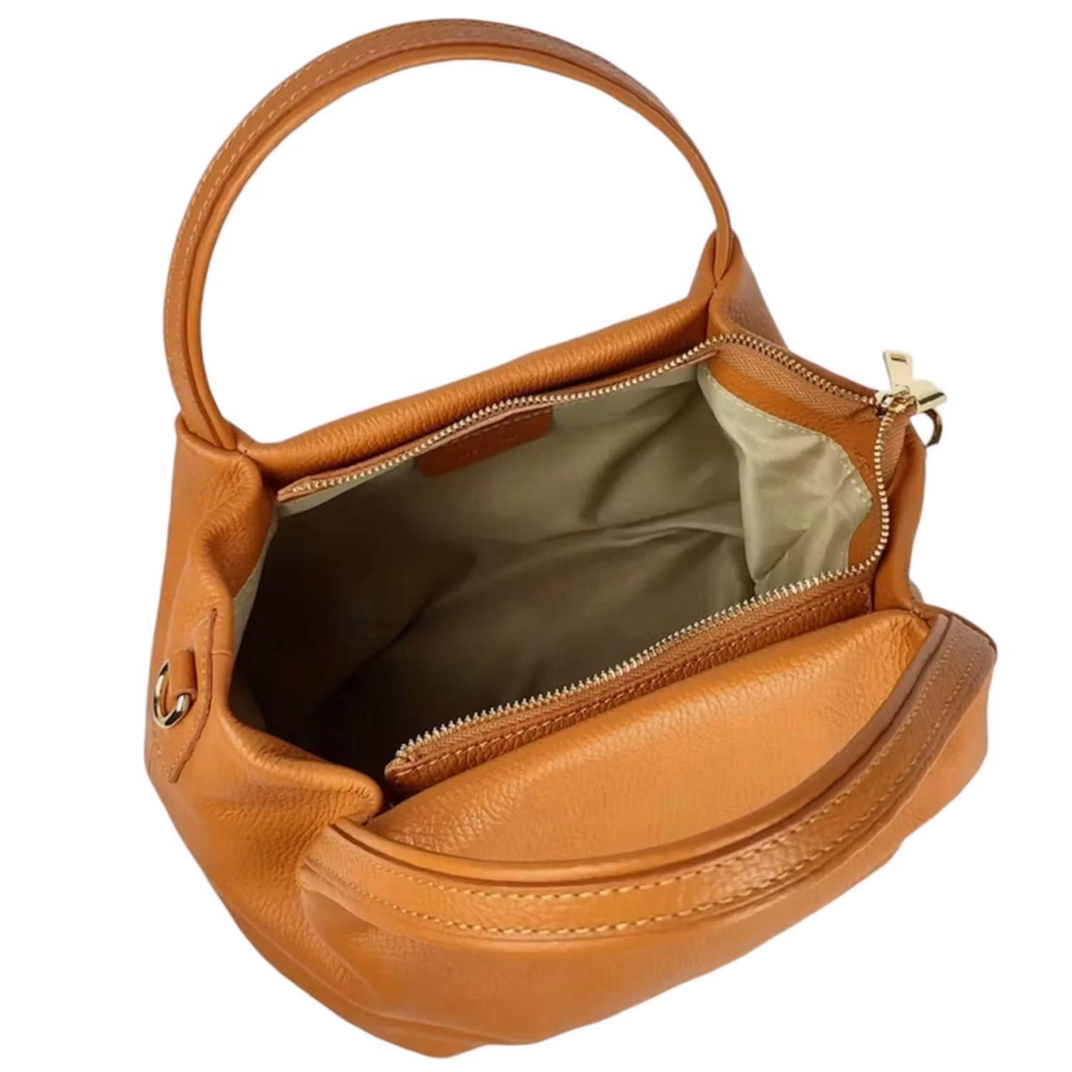 Den kompakta storleken gör den smidig att bära, men tillräckligt rymlig för mobil, plånbok, nycklar och andra måsten. Bär den i handen för ett sofistikerat uttryck eller använd den avtagbara axelremmen när du vill ha händerna fria.