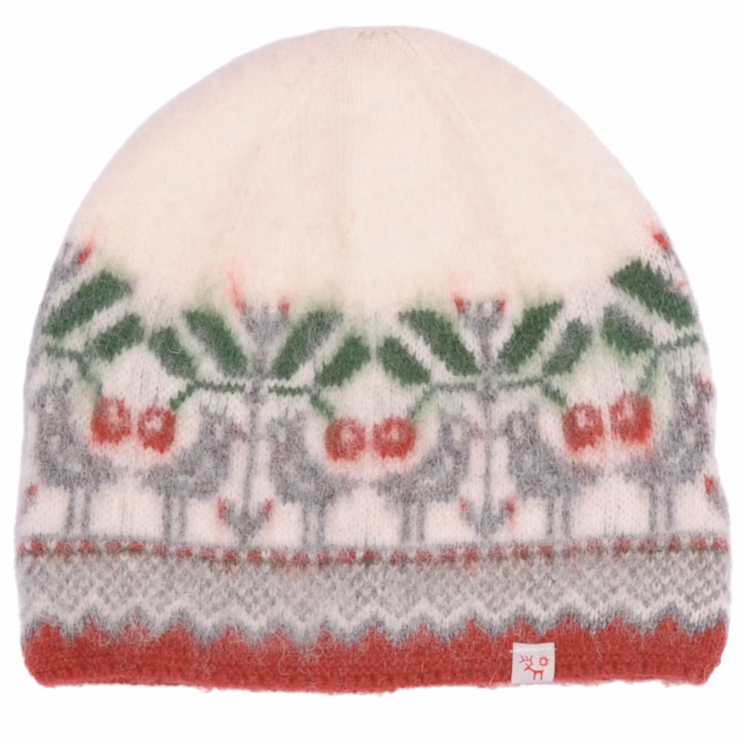 Varm och mjuk dammössa i borstad Shetlandsull med klassiskt, traditionsinspirerat mönster. Det detaljrika motivet med fåglar och blommor är inspirerat av äldre korsstygnsbroderier och ger mössan ett genuint hantverksuttryck. Invändigt är mössan fodrad med fleece som håller kvar värmen även under kalla vinterdagar.Mössan finns i två färgställningar - svart och vit - och är utformad i one size dam. En omtyckt accessoar som håller dig varm med stil - säsong efter säsong.