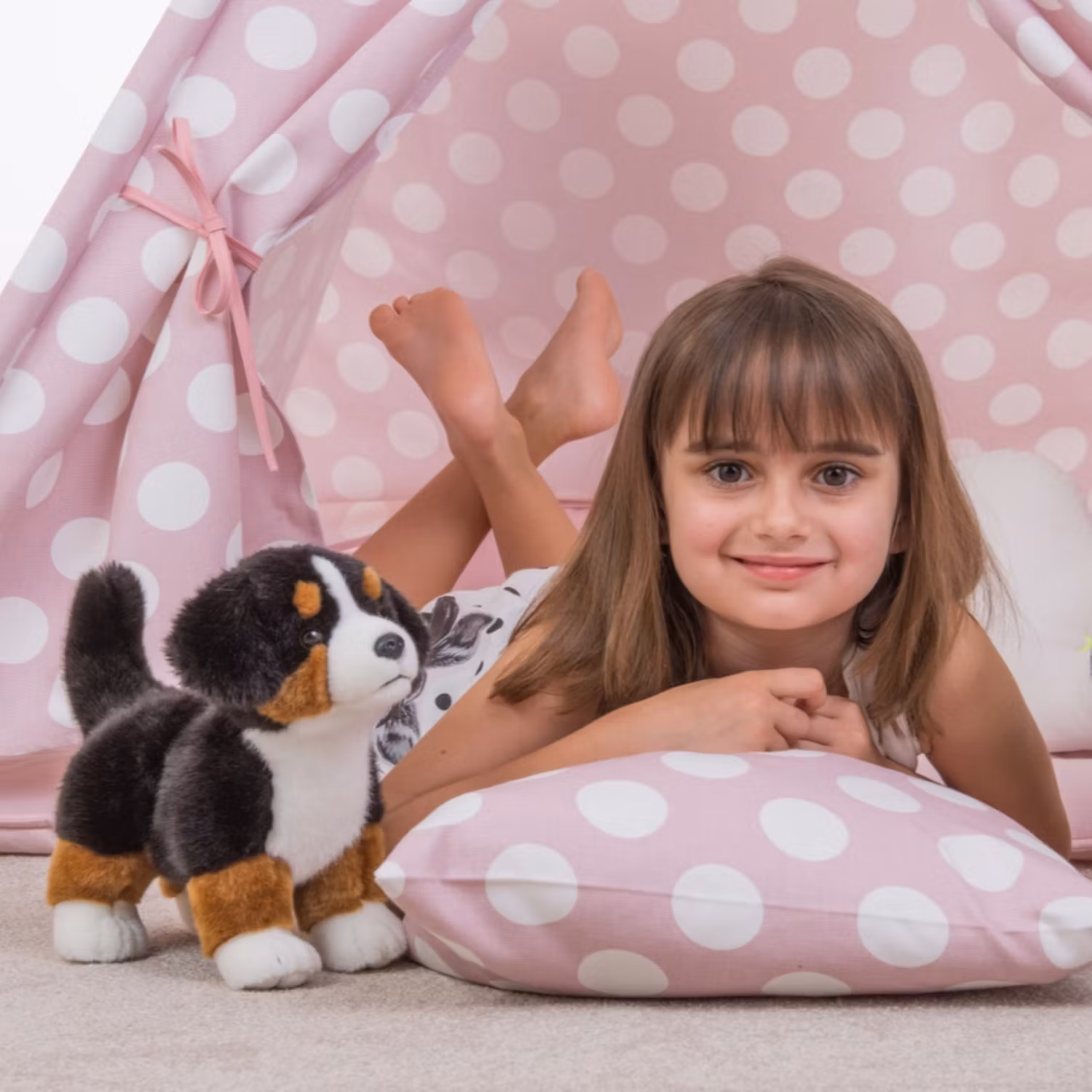 Den mjuka kroppen gör gosedjuret perfekt att krama och leka med, samtidigt som den stadiga formen gör att valpen kan stå fint som en dekorativ detalj i barnrummet. De noggrant utformade detaljerna ger en trogen känsla av den älskade hundrasen berner sennen, känd för sitt vänliga temperament och sin vackra päls.