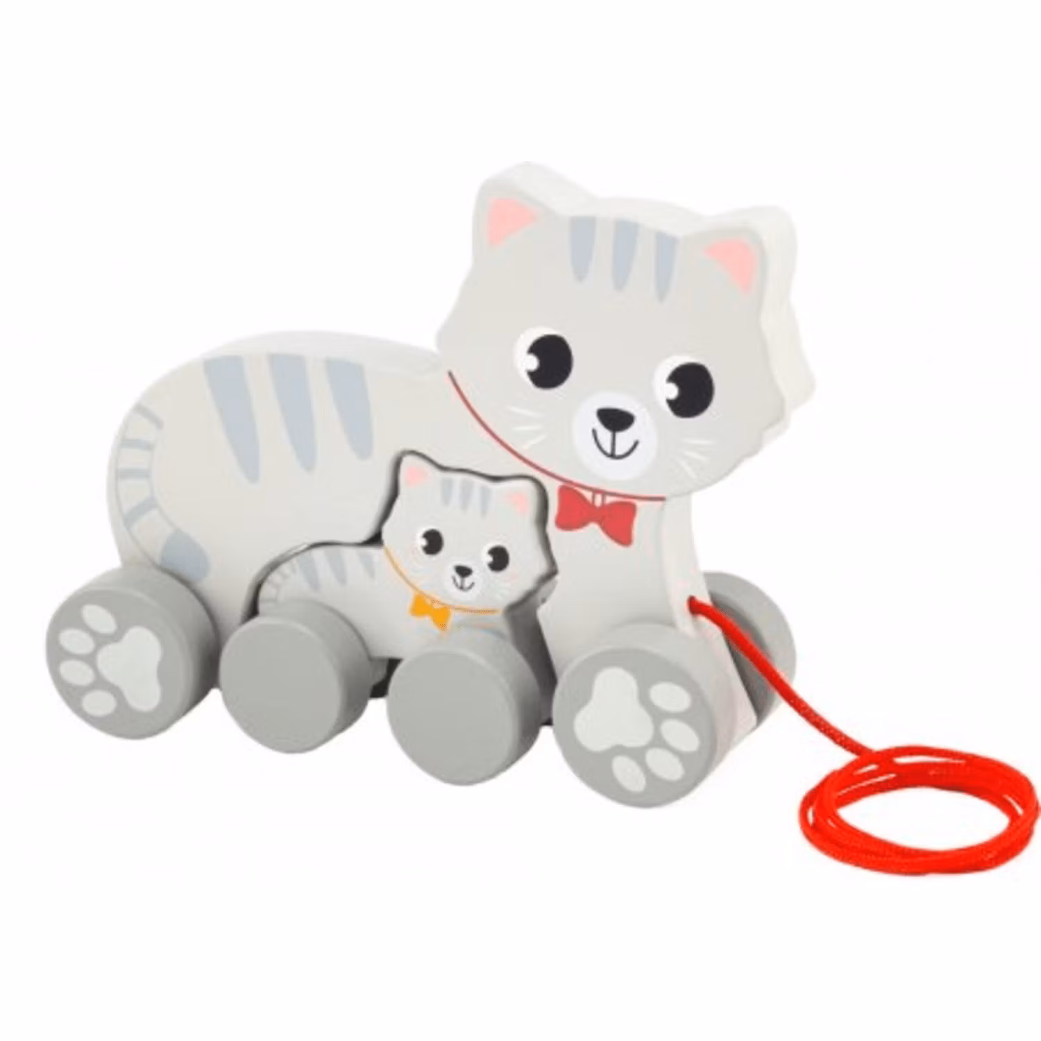 Fin dragleksak i trä i form av en katt och hennes kattunge
