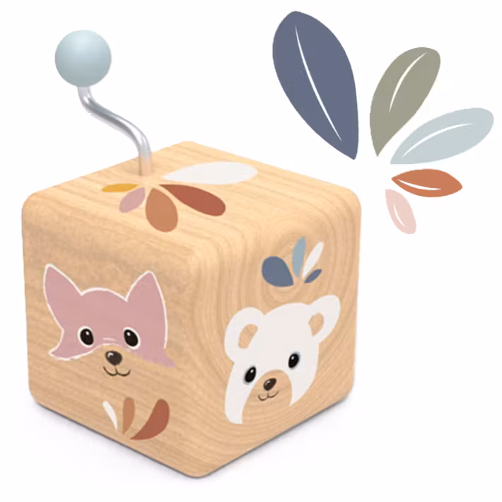 Genom att veva på handtaget spelas en mjuk melodi som stimulerar barnets hörsel och väcker nyfikenhet. Musiklådan är perfekt för små händer och passar lika bra för lek som för mysiga stunder före vila. Den uppmuntrar sensorisk utveckling, finmotorik och koncentration, samtidigt som den ger barnet en första upplevelse av musik.