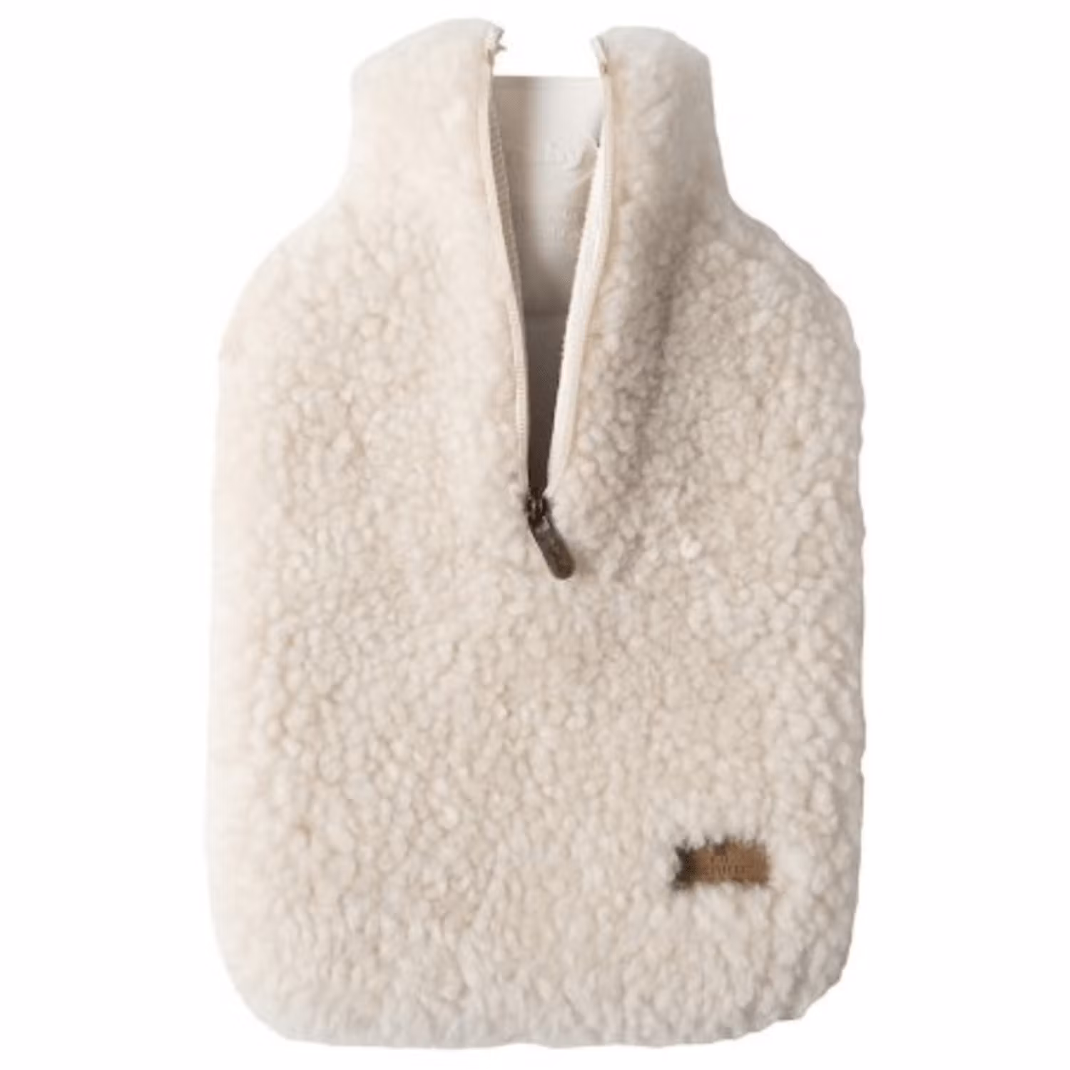 Varmvattenflaska med mjukt värmande fårskinnsfodral, fårskinn på framsidan och vävd ull på baksidan