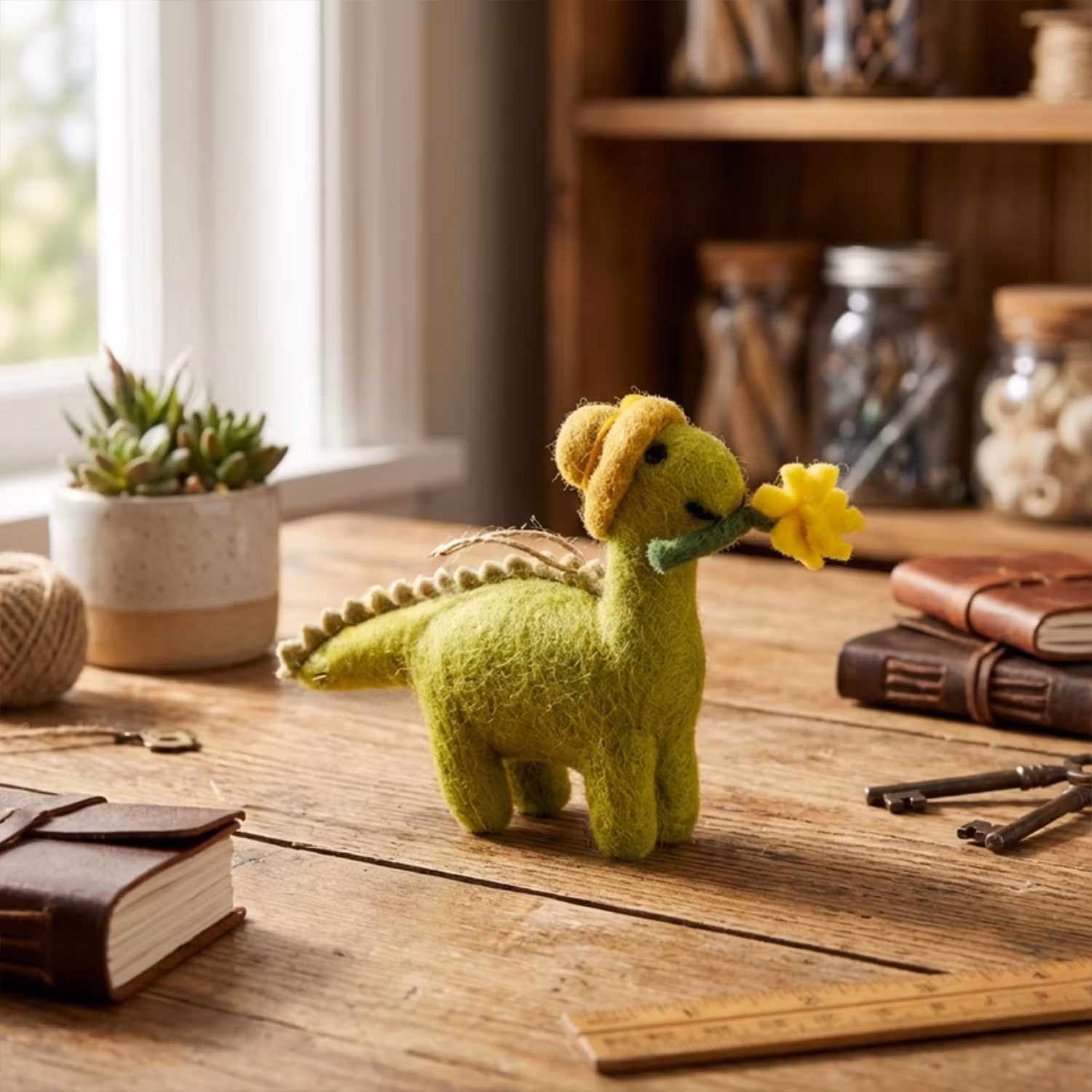 Unik ullfigur med charmiga detaljer - dinosaurie med blomma