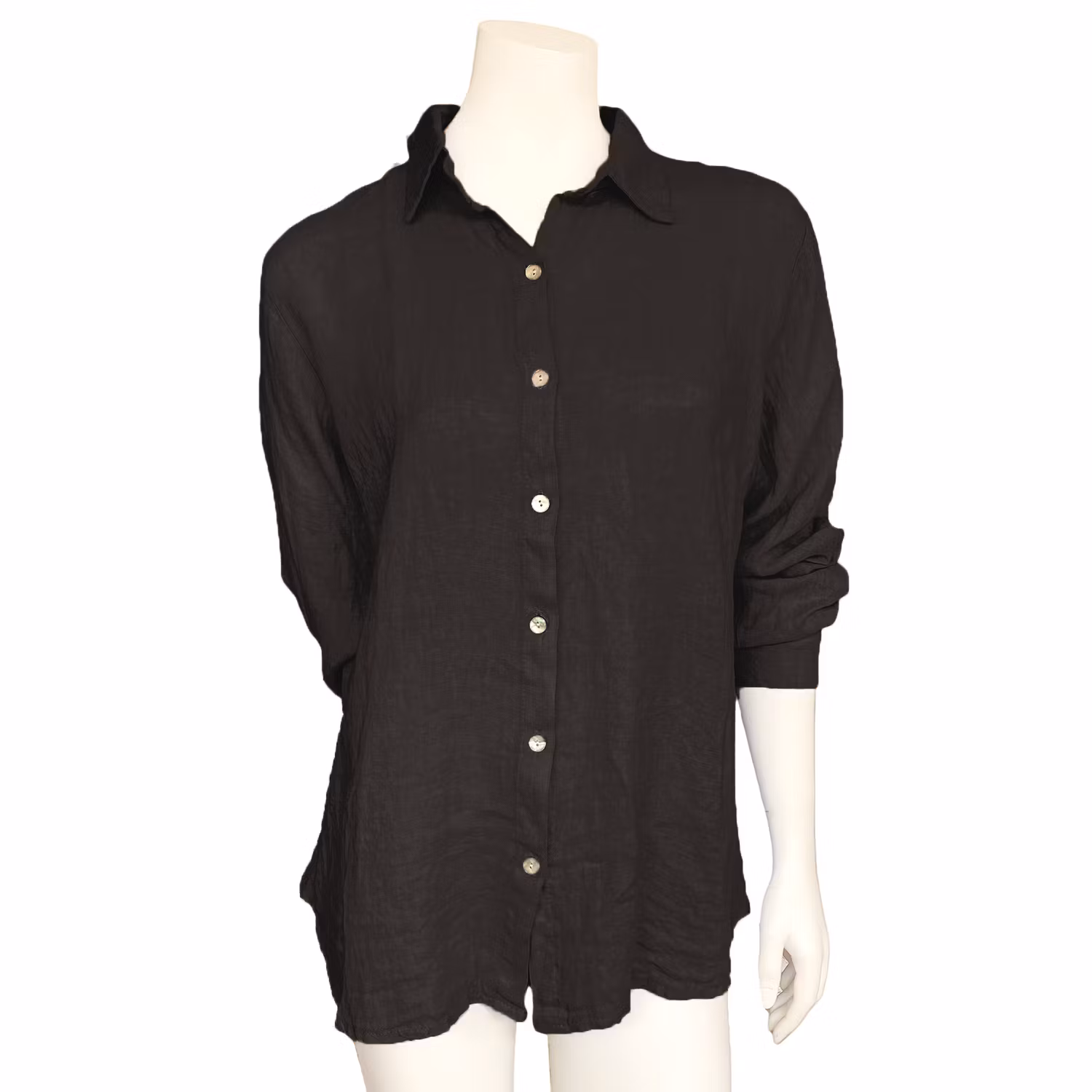 Donna är en tidlös svart linneskjorta i 100 % italienskt linne - perfekt för varma dagar och lediga stunder. Skjortan har en luftig, avslappnad passform med hellånga ärmar och knäppning framtill. Ett svalt, stilrent och mångsidigt tillskott till sommargarderoben.Egenskaper: