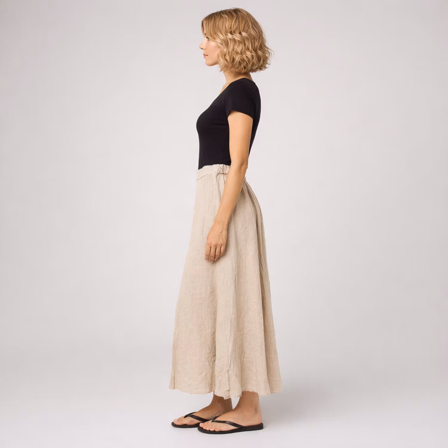 En lång kjol i beige linne är perfekt för sommarens varma dagar.